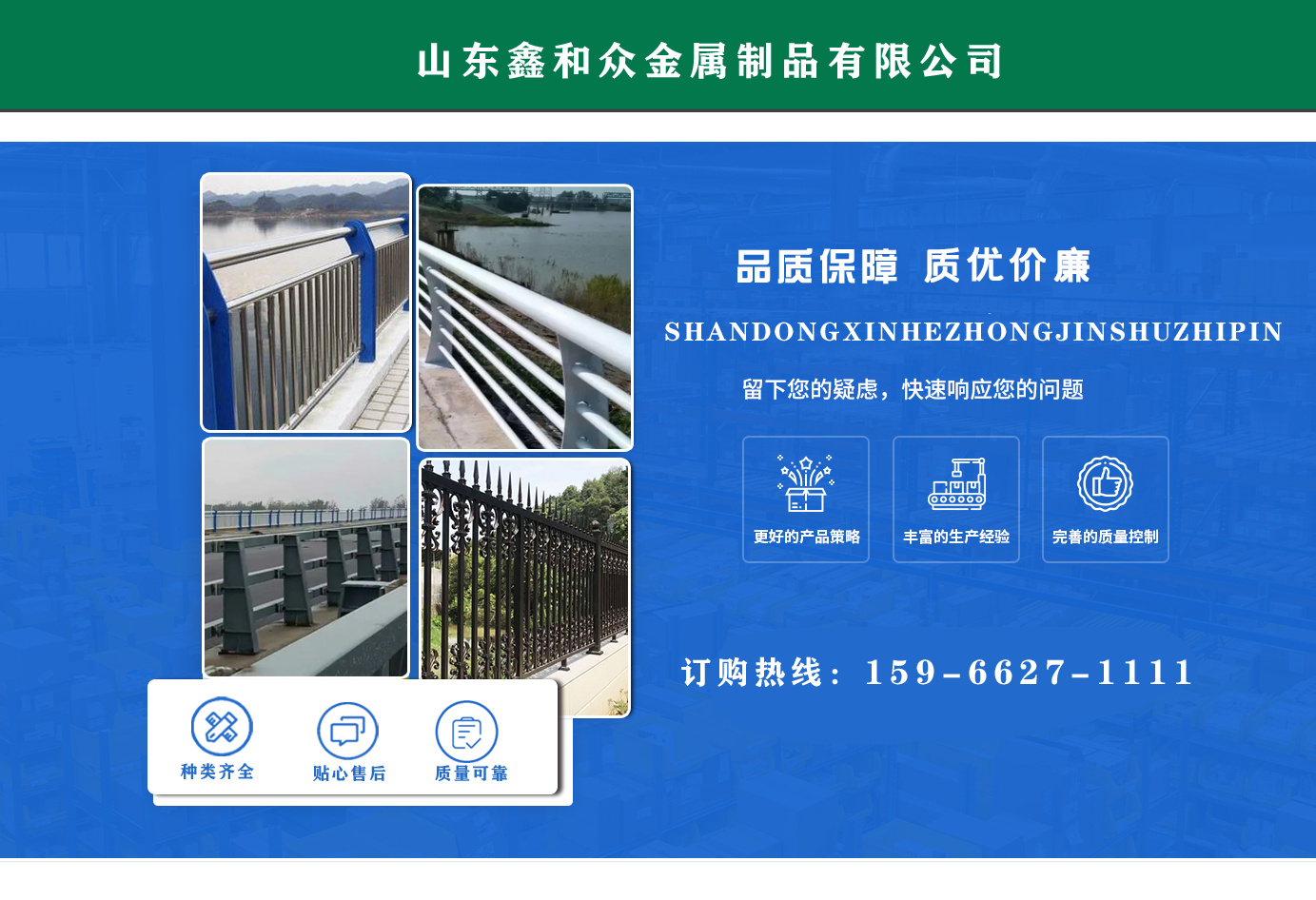 山東鑫和眾金屬制品有限公司主要產品有防撞護欄,橋梁護欄,道路護欄,河道護欄,不銹鋼護欄等護欄。提供設計方案,一站式定制,包您滿意價格優(yōu)惠,歡迎來電咨詢!    公司常年從事銷售護欄防撞護欄,橋梁護欄,道路護欄,河道護欄,不銹鋼護欄,橋梁鋼護欄,河道燈光護欄等。產品廣泛應用于橋梁、河道、旅游景區、道路、公路、公園、小區、景觀、道路防撞等領域。    公司產品均采用優(yōu)質不銹鋼材料,符合相關標準。各種型號不銹鋼復合管及護欄,質量嚴格把控。產品強度高、耐腐蝕、焊接牢固、抗沖擊、性能好,防撞護欄結構簡單、美觀實用大方。     歡迎前來訂購!...
